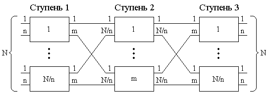 Рисунок 3.13– Трёхступенчатая (трёхзвенная) коммутационная схема.