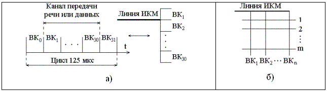 Рисунок 3.14 – а) Формат цикла ЦСП с ИКМ и схематичное изображение временного разделения каналов, б) Схема пространственного эквивалента временной коммутации.