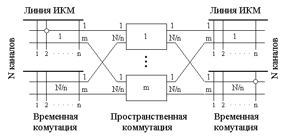Тип коммутации, приведённой на схеме, называют время – пространство – время (В – П – В). Как и на рисунке 3.13, здесь число входящих и исходящих каналов равно N. Эти каналы представлены в N/n входящих и исходящих линиях ИКМ. Работа такой коммутационной схемы аналогична работе трёхзвенной пространственной коммутационной (смотри рисунок 3.13). В пространственных коммутаторах второй ступени устанавливаются соединения временных каналов исходящих и входящих линий ИКМ [1].