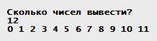 Конструкция цикла for состоит из трех частей, разделяемых знаком «точка с запятой». На каждой итерации цикла доступна переменная-счетчик, равная номеру итерации. Рассмотрим, как использовать цикл for для вывода на экран заданное количество чисел.