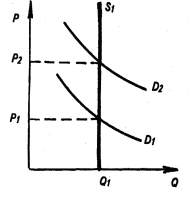 На рис.9 (а) представлена ситуация, когда спрос на товар вырос. Поскольку предложение этого товара сразу возрасти не сможет, ситуация мгновенного равновесия будет характеризоваться лишь повышением цены Кривая предложения S 1 представляет собой вертикальную линию с нулевой эластичностью, а сдвиг кривой спроса в положение D 2 увеличивает цену равновесия до P 2 .