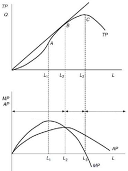 | III стадия. МР < АР, в результате чего совокупный продукт растет медленнее затрат переменного фактора. В точке С – maxTP, MP=0 IV стадия. МР < 0. Достигнута максимальная производительность фиксированных затрат; дополнительные единицы труда приводят к сокращению выработки. В результате прирост переменного фактора L приводит к уменьшению выпуска совокупной продукции |