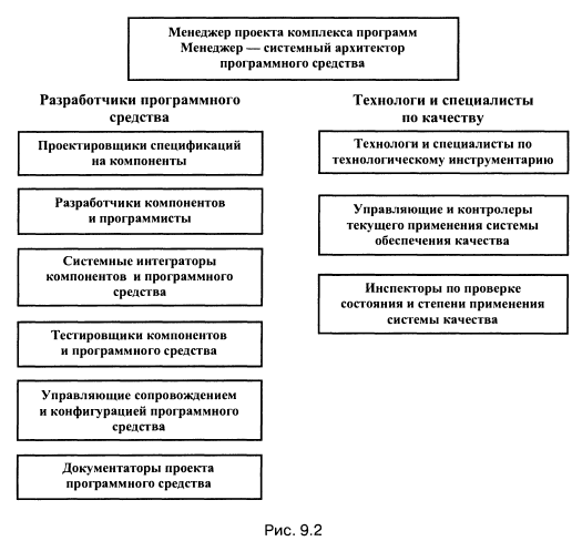 В реализации крупного проекта можно выделить две категории специалистов: разрабатывающих компоненты и ПС в целом и обеспечивающих технологию и качество программного продукта. Организационное разделение специалистов, осуществляющих разработку ПС (первая категория), и специалистов, контролирующих и управляющих его качеством в процессе разработки и всего ЖЦ (вторая категория), должно обеспечивать независимый, достоверный контроль качества результатов разработки и эффективное достижение заданных характеристик.