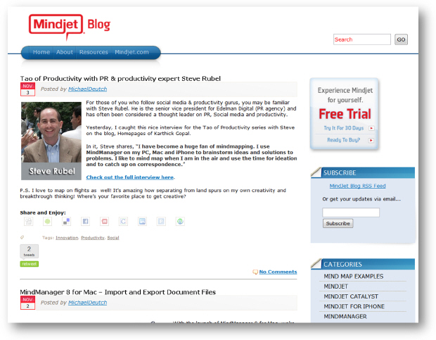 - Просматривайте ментальные карты, созданные другими людьми. Майндмеппинг стал довольно популярной техникой повышения персональной продуктивности, и в Сети можно найти множество библиотек готовых "ментальных карт" и их шаблонов. Начать можно с галерей на сайтах производителей ПО для майндмеппинга и их блогов, со временем вы обнаружите все больше подобных мест в Интернете. Не хотелось бы, чтобы это рассматривалось как реклама, но обратите внимание на блог производителей нашего любимого MindManager'а (https://blog.mindjet.com) – это именно то место, где можно увидеть массу примеров практического применения "ментальных карт". Зачем нужно знакомиться с картами, созданными другими майндмеперами, думаем, понятно: таким образом вы сможете увидеть чужой стиль разработки карт и, возможно, позаимствовать какие-то приглянувшиеся вам идеи.