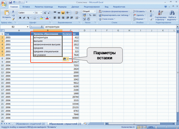 После вставки ячеек при копировании правее и ниже области вставки появляется кнопка Параметры вставки (рис. 5.5), которую используют при выборе особенностей вставки. При перемещении ячеек кнопка не появляется.