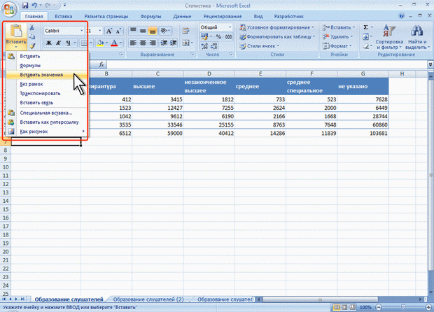 | Вставить значения | Вставляются только значения скопированных ячеек. Оформление и формулы не копируются |