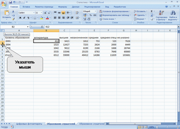 Высоту строки можно изменить, перетащив ее нижнюю границу между заголовками строк. Например, для того чтобы изменить высоту строки 2, следует перетащить границу между строками 2 и 3 (рис. 5.23). При этом во всплывающей подсказке отображается устанавливаемая высота строки.