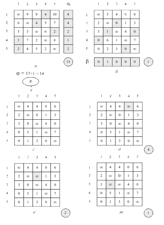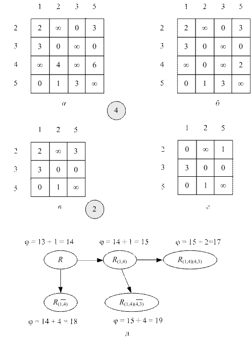 Рис. 8.2. Приведение матриц в задаче коммивояжера (окончание см. на с. 195) а – таблица до приведения ее по всем строкам; б – таблица после приведения ее по всем строкам; в – корневая вершина дерева T; г – таблица, приведенной по строкам и по столбцам; д – таблица расстояний между городами, по которой невозможно построить конечный кольцевой маршрут, содержащий дугу (1, 4); е и ж – аналогично исследуются все дуги таблицы на рис. г, имеющие нулевую длину