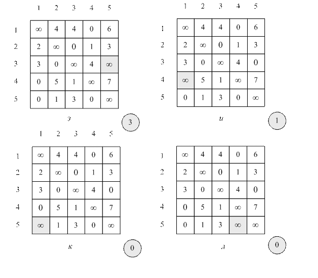 На рис. 8.2, д изображена таблица расстояний между городами, по которой невозможно построить конечный кольцевой маршрут, содержащий дугу (1, 4). Таблица на рис. 8.2, д получена из таблицы на рис. 8.2г заменой элемента первой строки четвертого столбца на символ бесконечности. В окружности на рис. 8.2, д указана сумма констант приведения для этой таблицы (4). Другими словами, если считать, что среди допустимых кольцевых маршрутов нет дуги (1, 4), то нижняя граница увеличится на 4. На рис. 8.2, е –8.2, л аналогично исследуются все дуги таблицы на рис. 8.2, г, имеющие нулевую длину.