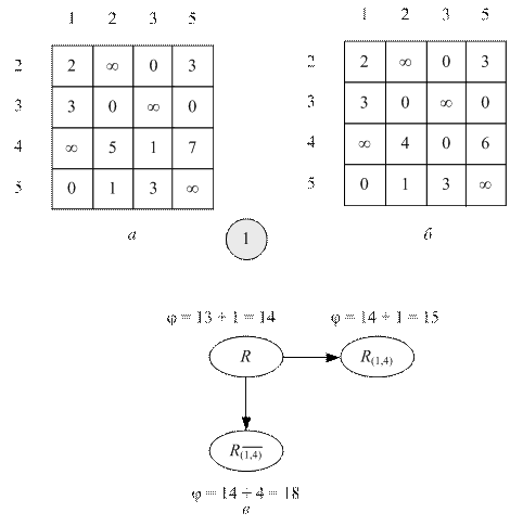Вторая ветвь решения, полученная процедурой BR,соответствует множеству допустимых кольцевых маршрутов, которые включают дугу (1, 4). Если дуга (1, 4) включается в кольцевой маршрут, то по всей видимости, следует этот факт запомнить и построить новую таблицу, в которой будет отсутствовать первая строка (во всех допустимых маршрутах из города 1 есть дуга только в город 4) и четвертый столбец (в город 4 есть единственная дуга и это дуга из города 1). Кроме того, очевидно, что допустимый кольцевой маршрут, содержащий дугу (1, 4), не может содержать дугу (4, 1), так как наличие этих двух дуг в кольцевом маршруте делает его недопустимым. Из этого следует, что на пересечении четверной строки и первого столбца надо поставить символ бесконечности. На рис. 8.4, а изображена таблица, полученная из таблицы на рис. 8.2, г вычеркиванием из нее первой строки, четвертого столбца и заменой значения в первом столбце четвертой строки на символ бесконечности. Сумма констант приведения, подсчитанная для этой таблицы, равна 1. На рис. 8.4, б изображена таблица, которая получена после приведения таблицы на рис. 8.4, а.