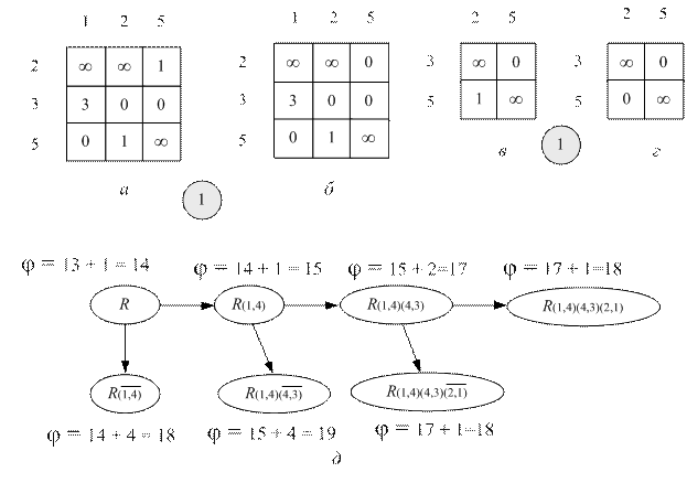 Таблица на рис. 8.6, в получена из таблицы на рис. 8.5, г удалением второй строки и первого столбца (это соответствует включению дуги в кольцевой маршрут), а также заменой значения в третьей строке второго столбца на символ бесконечности (позволяет блокировать образование неполного кольцевого маршрута). На рис. 8.6, г представлена таблица, полученная из таблицы на рис.8.6, в, после ее полного приведения. На рис. 8.6, д изображен очередной фрагмент графа T после добавления двух ветвей.