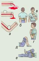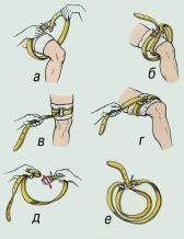 | Жгут следует накладывать при сильном артериальном кровотечении выше места ранения на верхнюю треть плеча, на все отделы бедра. Давление на конечность должно быть достаточным для прекращения кровотечения, но не вызывающим полного обескровливания конечности. Жгут может накладываться на конечность не более чем на 1,5 - 2 часа, а в холодное время года – 0,5 - 1 час. Периодически через 30 - 60 минут жгут следует ослабить, распустить на несколько минут (на это время пережать сосуд выше жгута пальцем), помассировать (легко) борозду от жгута, предварительно возобновив пальцевое прижатие артерии, и наложить вновь, но уже с большим натяжением. При отсутствии фабричного жгута его можно заменить импровизированным – резиновой трубкой, галстуком, ремнем, поясом, платком, бинтом и т.п. (рис. 5.3.), но не следует использовать проволоку. Для остановки кровотечения с помощью подручных средств используют так называемую закрутку, которую затем фиксируют отдельным бинтом. Остановка кровотечений из сосудов конечностей возможна при форсированном их сгибании (рис. 5.4.). Чаще этот способ применяется для остановки кровотечений из сосудов руки. Его рационально применять при интенсивном кровотечении из ран, расположенных у основания конечностей. Максимальное сгибание конечности производят в суставе выше раны и фиксируют конечность бинтами в таком положении. | Рис. 5.3. Использование поясного ремня в качестве кровооста-навливающего жгута: а, б, в, г – этапы наложения жгута; д, е – подготовка двойной петли. | |
