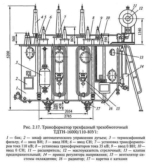 Мощный трансформатор высокого напряжения — сложное устройство, состоящее из большого числа конструктивных элементов, основными из которых являются: магнитная система (магнитопровод), обмотки, изоляция, выводы, бак, охлаждающее устройство, механизм регулирования напряжения, защитные и измерительные устройства, тележка.
