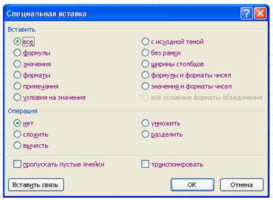 Наиболее широкими возможностями по управлению вставляемым содержимым ячеек, скопированных в буфер обмена, имеет диалоговое окно Специальная вставка, которое состоит из трех разделов. В первом разделе Вставить параметры позволяют выбрать режим вставки - компоненты выделенных ячеек, которые будут копироваться. Во втором разделе Операция параметры позволяют задать математические операции (Сложить Вычесть Умножить Разделить), которые выполняются при вставке данных из