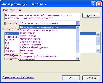 3. В раскрывающемся списке Категория выбрать категорию функции, к которой относится вводимая функция или Полный алфавитный перечень (см. рис. 4.2). После выбора категории в окне Выберите функцию отображаются только функции этой категории. В категории 10 недавно использовавшихся представлены функции, которые были использованы последнее время.