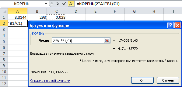 Рис. 4.6. Функция КОРЕНЬ вставлена в строку формул
