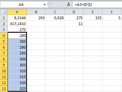 В ячейку А3 ввести значение ТН=275 (рис. 4.8). Выделяется диапазон А4:А13, в ячейку А4 вводится формула =А3+$F$1, которая копируется на диапазон А4:А13 – нажать на клавишу <Enter>, удерживая клавишу <Ctrl> (метод «Копирование один ко многим», см. п. 3.3). В соответствие с механизмом относительной адресации при копировании формулы на диапазон формула в ячейке А5 примет вид =А4+$F$1 и т.д. Одновременно с копирование формулы будет выполнено вычисление значений в ячейках А5:А13 (см. рис. 4.8).