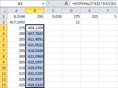 3. Вычисляется таблица значений VB=φ(Т) для ряда значений температур T=(T1,T2,…,TN), заданных в диапазоне А3:А13. Выделяется диапазон В3:В13 (рис. 4.9), в ячейку В3 вводится формула =КОРЕНЬ(2*A$1*A3/C$1), которая копируется на диапазон B3:B13 – нажать на клавишу <Enter>, удерживая клавишу <Ctrl>. В соответствие с механизмом относительной адресации, при копировании формулы на диапазон в ячейке B4 формула примет вид = КОРЕНЬ(2*A$1*A4/C$1) и т.д. Одновременно с копирование формулы будет выполнено вычисление значений в ячейках B3:B13 (см. рис. 4.9).