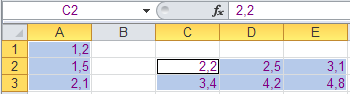 На рис.5.1 представлены два массива. Первый массив – одномерный, размером 3х1 (содержит три строки и один столбец) включает ячейки диапазона массива А1:А3. Второй массив размером 2х3 – двумерный. Он объединяет ячейки диапазона массива С2:Е3 и содержит две строки и три столбца