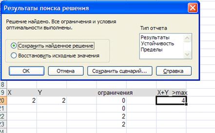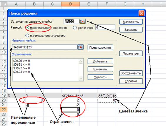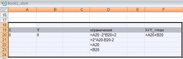 Шаг 1. Заданы начальные приближения переменных X,Y; целевая (ьаксимизируемая) формула, и выражения для ограничений