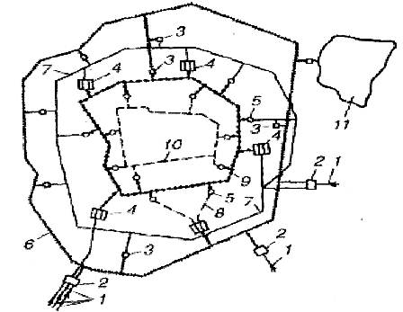1 -магистральные газопроводы; 2 -газораспределительные станции (ГРС); 3- контрольно-регуляторные пункты (КРП); 4 -газопроводы низкого давления; 5-газорегуляторные пункты (ГРП); 6-кольцо газопроводов высокого давления (2 МПа); 7 -кольцо газопроводов высокого давления 1,2 МПа; 8 -газопроводы высокого давления, 0,6 МПа; 9 -кольцо газопроводов среднего давления, 0,3 МПа; 10 -перемычка; 11- подземное хранилище газа