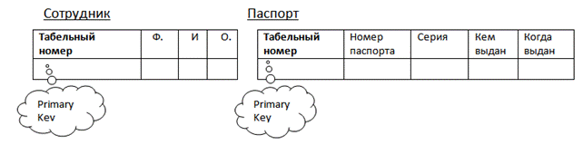 Связи «один - к - одному» обеспечиваются автоматически при одинаковых первичных ключах. Например, между таблицей «Сотрудник» с ключом Табельный номер, и таблицей «Паспорт» с таким же ключом (рис. 2.6).