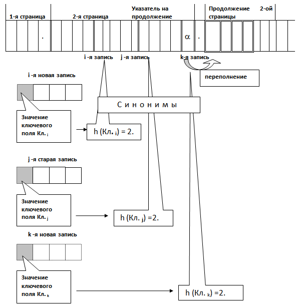 Значением хеш - свертки ключа в этом случае является номер страницы, куда помещается или где находится соответствующая запись (см. рис. 2.21).