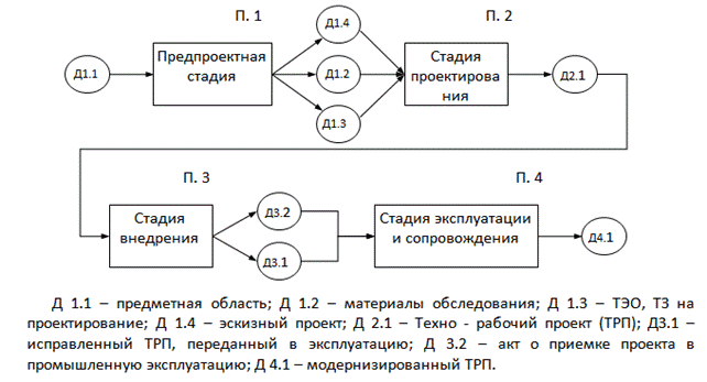 На этапе «Эксплуатация проекта» получают информацию о работе всей системы в целом и отдельных ее компонентов и собирают статистику о сбоях системы в виде рекламаций и замечаний, которые накапливаются для выполнения следующего этапа. На этапе «Сопровождение проекта» выполняются два вида работ: ликвидируются последствия сбоев в работе системы и исправляются ошибки, не выявленные при внедрении проекта, а также осуществляется модернизация проекта. В процессе модернизации проект либо дорабатывается, т.е. расширяется по составу подсистем и задач, либо производится перенос системы на другую программную или техническую платформу с целью адаптации ее к изменяющимся внешним и внутренним условиям функционирования, в результате чего получают документы модернизированного «Техно - рабочего проекта» (Д 4.1).