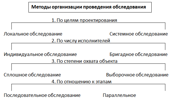 · по числу исполнителей, проводящих обследование, применяется индивидуальное обследование, осуществляемое одним проектировщиком, и бригадное с выделением ряда бригад исполнителей, изучающих все подразделения предприятия, и одной координирующей бригады;