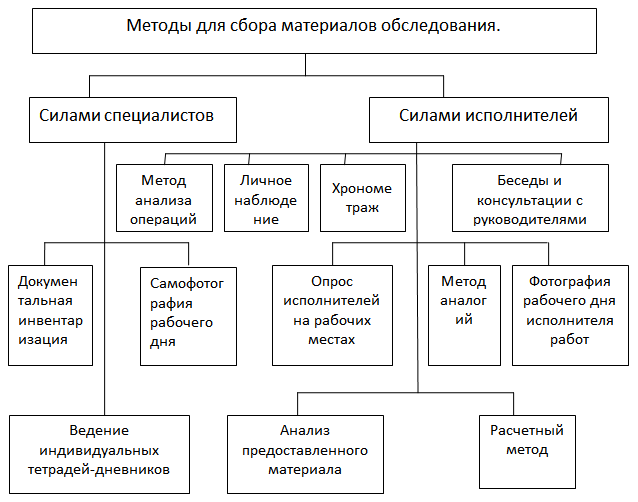 · методы сбора, выполняемого силами проектировщиков-исполнителей, включающие методы проведения бесед и опросов, анализа материалов обследования, личных наблюдений, фотографии рабочего дня и хронометража рабочего времени специалиста при выполнении им той или иной работы;