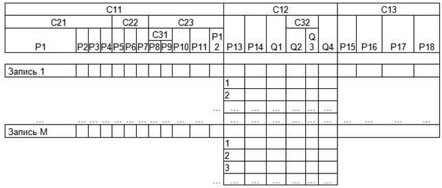 Общая часть документа – C11.(C21,C22,C23); C21 (P1 – номер накладной, P2 – дата, P3 – вид операции, P4 – код склада). C21.(P1,P2,P3,P4); Pi – реквизиты-признаки.