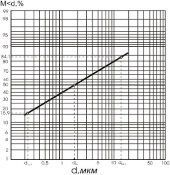 Как известно, в вероятностно-логарифмических координатах дисперсный состав большинства пылей аппроксимируется прямой линией и характеризуется двумя параметрами: среднемедианнымразмером dm и среднеквадратическим отклонением lgσn функцийраспределения. Среднемедианный размер dm представляетсобой такой размер частицы, при котором суммарная массавсех частиц размером более dm равна суммарной массе всех частиц размером менее dm. Среднеквадратическое отклонение lgσn находят из следующего соотношения, которое является свойством интеграла вероятности: