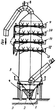 Рис. 8.1. Общий вид форсуночного скруббера для охлаждения и увлажнения доменного газа: 1 — клапан с контргрузом; 2 — смывной патрубок; 3 — сливной канал; 4 — гидрозатвор; S — люк; 5 — регулирующие задвижки; 7 — подвод воды к зонам орошения; 8 — свеча; 9—12— зоны орошения; 13 — промывочные задвижки.
