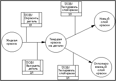 Если диаграммы PFDD технологический процесс "С точки зрения наблюдателя", то другой класс диаграмм IDEF3 OSTN позволяет рассматривать тот же самый процесс "С точки зрения объекта". На рис.2 представлено отображение процесса окраски с точки зрения OSTN диаграммы. Состояния объекта (в нашем случае детали) и Изменение состояния являются ключевыми понятиями OSTN диаграммы. Состояния объекта отображаются окружностями, а их изменения направленными линиями. Каждая линия имеет ссылку на соответствующий функциональный блок UOB, в результате которого произошло отображаемое ей изменение состояния объекта.