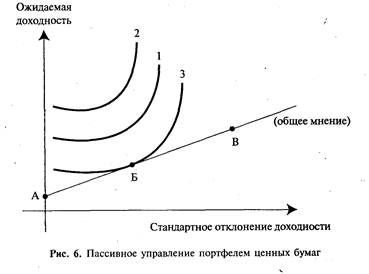 Под пассивным управлением понимают приобретение и владение ценными бумагами в течение весьма продолжительного времени с небольшими и редкими изменениями портфеля. Пассивные менеджеры предполагают, что все финансовые рынки относительно эффективны для достижения успеха в выборе ценных бумаг или времени их приобретения. Они принимают решения исходя из общепринятой на рынке оценки риска и доходности. Их тактика состоит в создании хорошо диверсифицированного портфеля с заранее определенным уровнем риска и продолжительном удерживании его в неизменном состоянии (за исключением реинвестирования доходов и некоторой корректировки портфеля для достижения точного соответствия выбранному показателю). Сформированные ими портфели представляют собой зеркальное отражение рыночного портфеля, состоящего из всех ценных бумаг, присутствующих на рынке, в том же их соотношении относительно совокупной стоимости фондовых инструментов на рынке.