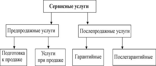 Услуги, предоставляемые покупателю при продаже продукции, могут быть весьма разнообразными, но в целом они делятся на: предпродажные; послепродажные, в том числе гарантийное и послегарантийное обслуживание (рисунок 1).