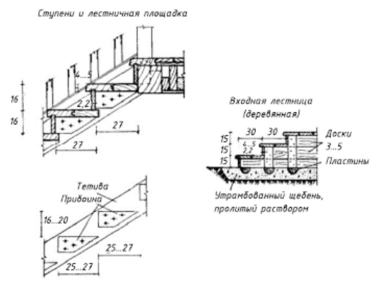Несущими элементами деревянных лестниц служат площадки, балки и тетивы (толщиной 60...80 мм).