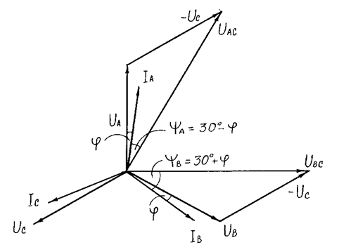 Углы сдвига по фазе ψA = 30°−φ между векторами UAC и IA и ψB = 30°+φ между UBC и IB определяем по векторной диаграмме рис. 12.