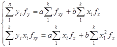 Если данные сгруппированы и имеется частота повторений fx и fy, то система уравнений имеет вид: