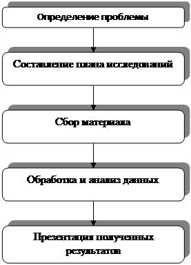 Процесс проведения исследования состоит из нескольких этапов. Он начинается с определения проблемы и составления проекта исследования. Последующими этапами являются сбор материала, его анализ и составление отчета о результатах. Эти этапы показаны на рис. 3