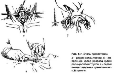До вскрытия трахеи необходим тщательный гемостаз. Для фиксации гортани, экскурсии которой при асфиксии значительно выражены, вкалывают острый крючок в щитоподъязычную мембрану и фиксируют кверху. Во избежание сильного кашля в трахею вводят через иглу несколько капель 2-3% р-ра дикаина. Остроконечным скальпелем вскрывают 2 и 3 кольца трахеи. Скальпель необходимо вонзать не слишком глубоко (0,5 см), чтобы не поранить заднюю, лишенную хряща, стенку трахеи и прилегающую к ней переднюю стенку пищевода. Края отверстия в трахее раздвигают при помощи расширителя Труссо и вводят соответствующего размера трахеотомическую трубку, которую фиксируют с помощью марлевой повязки на шее.