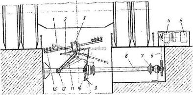 (Движение через цепную передачу 6 от электродвигателя 5 с редуктором При пршцении копира диск приводится во вращение через фрикционную передачу резина но стали. Для стабильности работы зацепления копир 10 выполнен наклонным и снабжен противовесом 9. Вода в коллекторы подается но каналам, выполненным в оси 12 и консоли 11, насосным агрегатом тина ЦВ-5-140. Привод выведен из зоны загрязнения и установлен мне канавы и вращение к рабочему органу передается валом 8 с муфтой 7. И систему управления входят два электрических и два гидравлических датчика и злектрошкаф. Электрический датчик состоит из стойки, на которой смонтирован концевой выключатель с поводком, взаимодействующим с колесом автомобиля.