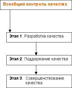Под Всеобщим контролем качества Фейгенбаум понимал такую систему, которая позволяла решать проблему качества продукции, и ее цены в зависимости от выгоды потребителей, производителей и дистрибьютеров. Фейгенбаум предложил рассматривать качество не как конечный результат производства изделия, а на каждом этапе его создания. Согласно данной концепции, модель Всеобщего контроля качества выглядела следующим образом: