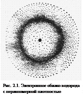 Быстро движущийся электрон, обладающий свойствами волны, может находиться в любой части пространства, окружающего ядро, и совокупность различных его положений рассматривается как электронное облако с определённой плотностью отрицательного заряда. Более наглядно это можно представить так. Если бы удалось через ничтожно малые промежутки времени сфотографировать положение электрона в атоме водорода (оно отразится на фотографии в виде точки), то при наложении множества таких фотографий получилась бы картина электронного облака (рис. 2.1). Плотность электронного облака неравномерна. Там, где точек наибольшее число, облако будет наиболее плотным, что будет отвечать наибольшей вероятности пребывания электрона в данной части атомного пространства.