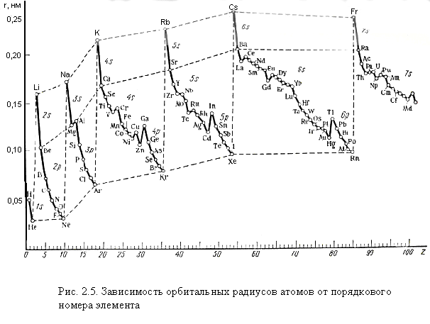 Атомные радиусы элементов периодически изменяются в зависимости от величины заряда ядра (рис. 2.5):