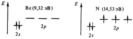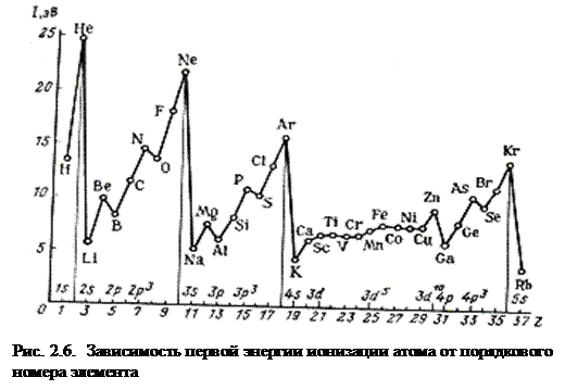 Воспользуемся сказанным для объяснения рис. 2.6. Как видно, внутренние максимумы на кривой первой энергии ионизации соответствуют элементам, у которых внешние уровни завершены – (Be, Mg, Zn) или заполнены наполовину – p3 (N,P,As), что свидетельствует о повышенной устойчивости подобных конфигураций:
