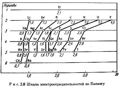 . Имеется около 20 шкал электроотрицательностей, в основу расчета значений которых положены разные свойства вещества. Значения электроотрицательностей разных шкал отличаются, но относительное расположение элементов в ряду электроотрицательностей примерно одинаково. В шкале относительных электроотрицательностей (ОЭО) по Полингу (рис. 2.8) электроотрицательность фтора принята равной 4,0.