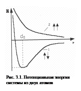 б) если спины электронов паралельны (↑↑), энергия системы при любом расстоянии между сближающимися атомами больше, чем сумма энергий двух отдельных атомов (кривая 2) и образование химической связи невозможно.