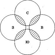 Например, в делении: Страны мира делятся на северные, южные, восточные и западные допущена ошибка — пересечение результатов деления. На первый взгляд приведенное в качестве примера деление кажется безошибочным: оно проведено по одному основанию (сторона света) и является полным (все стороны света перечислены). Чтобы увидеть ошибку в данном делении, надо рассуждать так. Возьмем какую-нибудь страну, например, Канаду, и ответим на вопрос — является ли она северной? Конечно, является, так как расположена в северном полушарии Земли. Теперь ответим на вопрос, является ли Канада западной страной? Да, потому что она расположена в западном полушарии Земли. Таким образом, получается, что Канада — одновременно и северная, и западная страна, т. е. она является общим элементом объемов понятий северные страны и западные страны, а значит, эти понятия, а вернее, их объемы, пересекаются. То же самое можно сказать и относительно понятий южные страны и восточные страны. На схеме Эйлера результаты деления из нашего примера будут располагаться так (рис. 15).