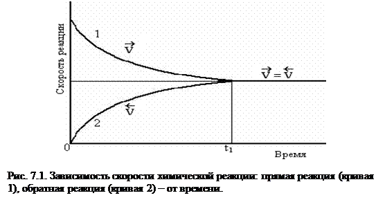 Все обратимые реакции идут до состояния равновесия. Реакция, протекающая в правую сторону (→) – прямая реакция, а в левую сторону (¬) – обратная реакция. Кинетические кривые для прямой (1) и обратной (2) реакции представлены на рис. 7.1.
